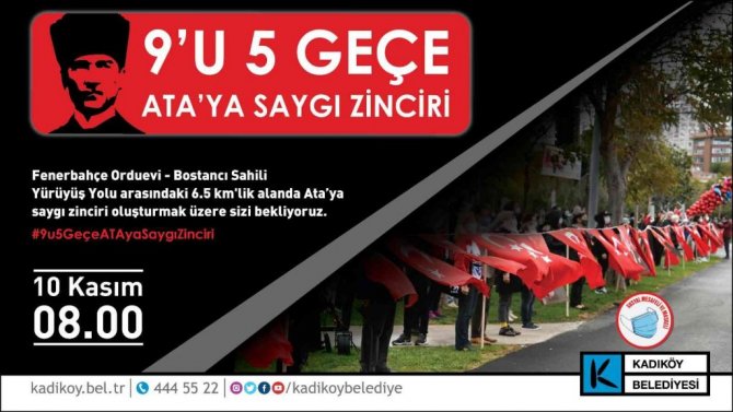 Cumhuriyet'in kurucusu Ulu Önder Mustafa Kemal Atatürk'ün ebediyete intikalinin 83'üncü yılında Ata'yı anma kapsamında düzenlenen Ata'ya Saygı Zinciri için sabah 8 itibariyle Fenerbahçe Orduevi ile Bostancı sahil arasında toplanma başlayacak. 2013 yılından bu yana Kadıköy Belediyesi ve Kadıköy Belediyesi Gönüllüleri tarafından düzenlenen "Ata'ya Saygı Zinciri'ne, denizden de kanolar, su jetleri ve tekneler 9'u 5 geçe sirenlerini çalarak katılacak. Dalgıçlar da denizin altında Atatürk posteri ve Türk bayrağı açacak.