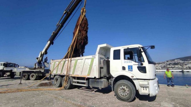 Aydın'ın Kuşadası ilçesinde Güvercinada'nın kuzey yakasında 10 ton ağırlığındaki hayalet ağ denizden parça parça çıkarılıyor.