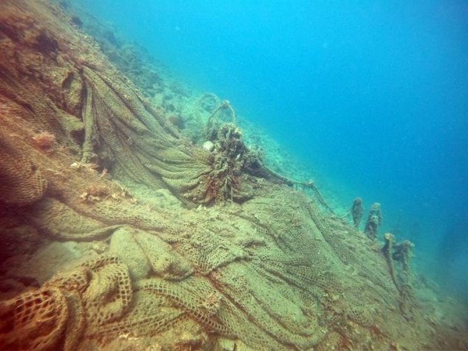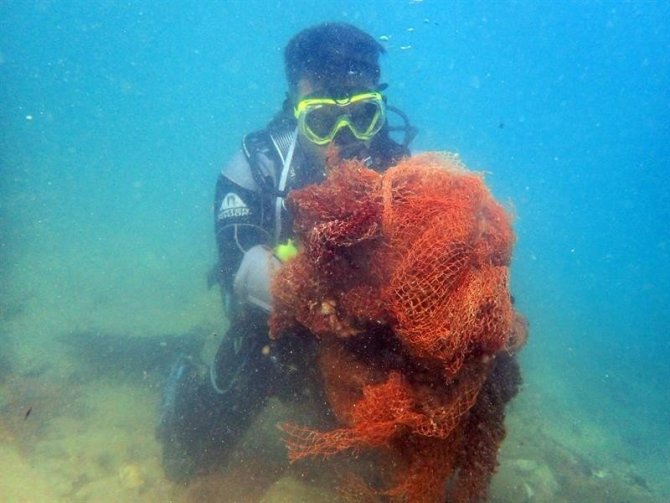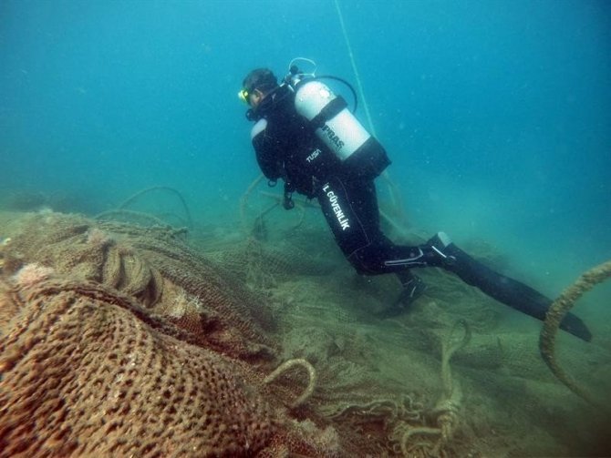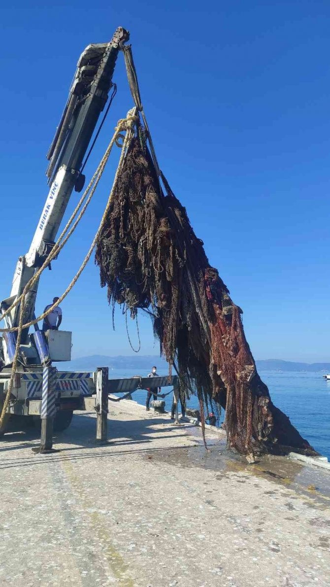 10 ton ağırlığındaki hayalet ağ denizden çıkarılıyor