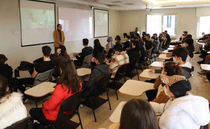 Sağlık Bilimleri Fakültesi Beslenme ve Diyetetik Bölümü'nden Öğr. Gör. Funda Esin Fakılı, bölümün çalışma alanları, akademik kadrosu, iş olanakları ve sunulan eğitime ilişkin bilgi verdi. Beslenme ve Diyetetik Bölümünün akredite olduğunu hatırlatan Öğr. Gör. Fakılı, "Bölüm laboratuvarlarımızda gerekli uygulamaları yaparak, teorik ve pratik eğitimi bir arada veriyoruz. Bölümümüz, öğrenci kulübümüzle iş birliği içinde pek çok sosyal sorumluk projesine imza attı" diye konuştu.