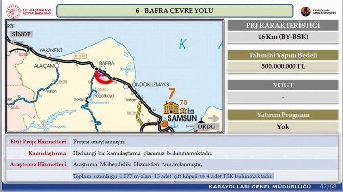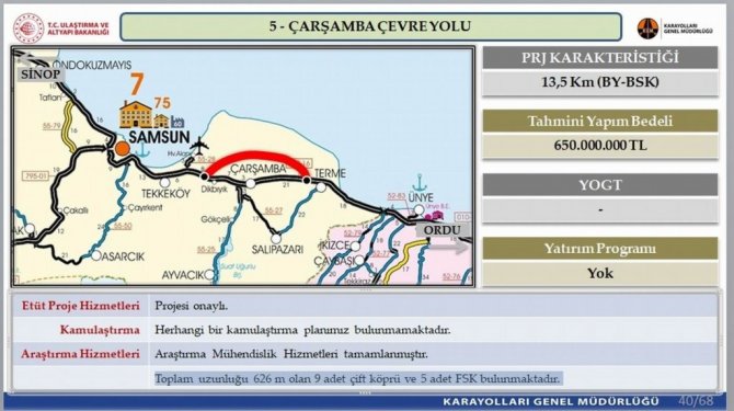 650 milyon TL tahmini yapım bedelli Çarşamba Çevre Yolu'nun projesi onaylandı. Uzunluğu 13,5 km olan projenin herhangi bir kamulaştırma planı bulunmuyor. Araştırma mühendislik hizmetleri tamamlanmış projede toplam uzunluğu 626 m olan 9 adet çift köprü ve 5 adet FSK bulunuyor. 500 milyon TL tahmini yapım bedelli Bafra Çevre Yolunun projesi onaylandı. Uzunluğu 16 km olan projenin herhangi bir kamulaştırma planı bulunmuyor. Araştırma mühendislik hizmetleri tamamlanmış projede toplam uzunluğu 1.077 m olan 13 adet çift köprü ve 4 adet FSK bulunuyor. 480 milyon TL tahmini yapım bedelli Terme Çevre Yolu Projesi de onaylandı. Uzunluğu 12,6 km olan projenin herhangi bir kamulaştırma planı bulunmuyor. Araştırma mühendislik hizmetleri tamamlanmış projede Toplam uzunluğu 640 m olan 4 adet çift köprü ve 5 adet FSK bulunuyor.