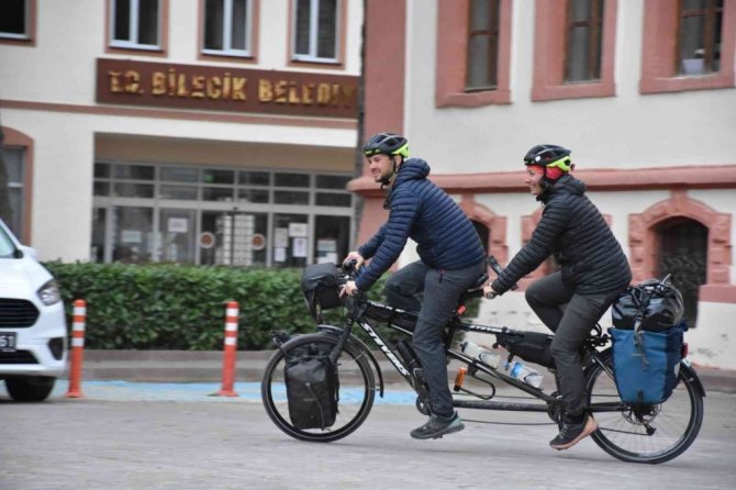 Fransa'da yaşayan mühendis Mathiue Tournier ve Mathilde Poisson çifti, Antalya ve Kapadokya'nın ardından Bilecik'e geldi. Fransa'dan tandem adı verilen bisikletleriyle başladıkları maceralarına 12 ülke ve 10 bin kilometre sığdıran maceraperest çift, soluğu Bilecik'te aldı. Bilecik'in tarihi ve doğal güzellikleri hakkında bilgi alan genç çift Bilecik'e hayran kaldı. Tarihi Belediye Binası'nda duydukları memnuniyeti dile getiren bisikletli çift, "Genelde yaşadığımız şehirde ulaşımı sağlarken bisikleti tercih ediyoruz. Bu yüzden bisiklet sürmeye alışkınız. Bu tura da "tandem" bisikletle çıkmaya karar verdik" ifadelerini kullandı.