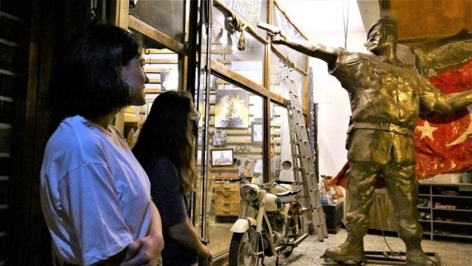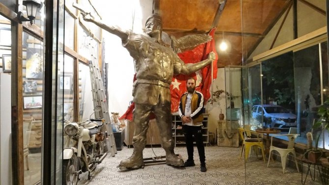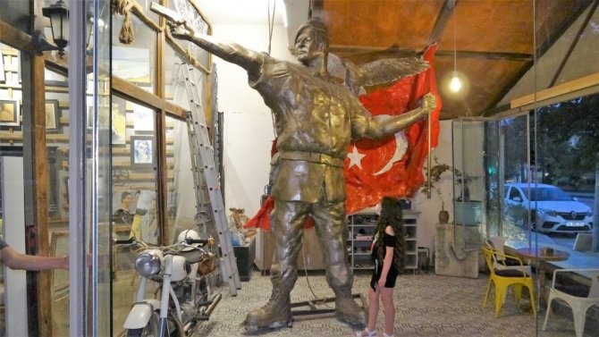 Tokat'ta, bir iş yerinin girişinde bulunan 15 Temmuz'un kahramanlarından Ömer Halisdemir'in heykeli dikkat çekiyor.