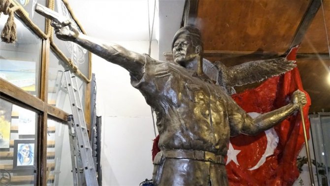 Heykelin önce ana iskeletini çelik malzeme kullanarak oluşturduğunu belirten Koçak, "Kil, çamur malzemesi kullanarak modelleme yaptım. Kalıptan sonra döküm yaptım. Döküm yaptığımız parçaları birleştirerek içine tekrar çelik yapıyoruz. Bu anlamda uzun süren zahmetli bir çalışma oluyor. Polyester ve epoksinin kokusu, kimyasal malzemeler kullandığımızdan zorlu bir süreç yaşandı. Yaklaşık 1 yılda ara ara çalışarak heykeli yaptık" diye konuştu.