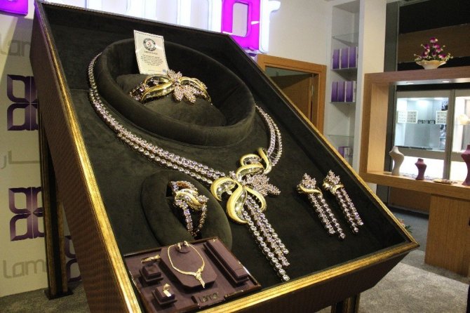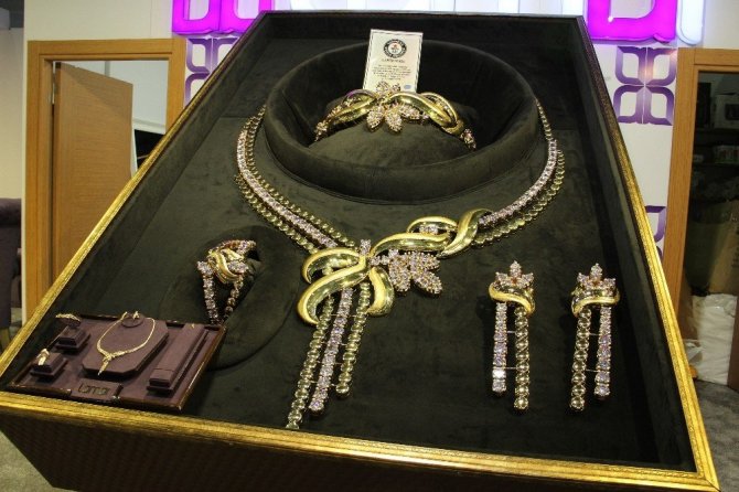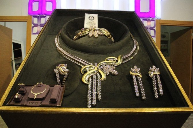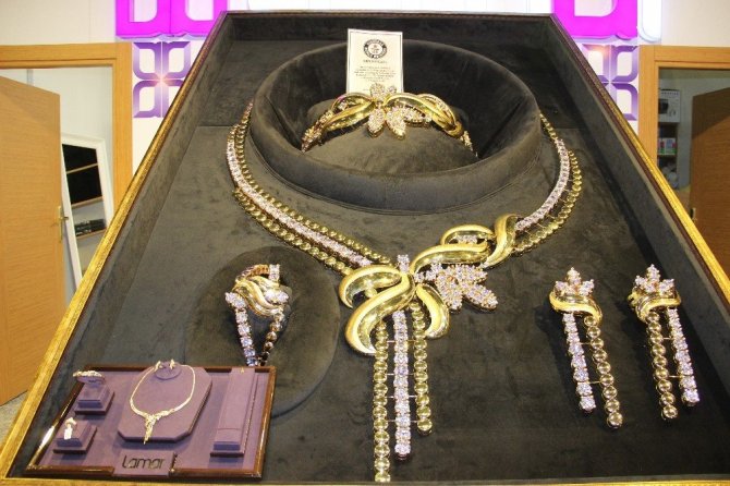 Fuarda ilginç tasarım ürünler dikkat çekiyor. Bunlardan birisi 33 kilo ağırlığındaki yaklaşık 1,6 milyon dolarlık kolye olarak öne çıkıyor. Pırlanta işlemelerle süslenen dev kolye Suudi Arabistan’da imal edilip fuar amaçlı olarak Türkiye’ye getirildi. Üretici firmanın yetkilisi Omar E. Sultani Al-Ashrafi, kolyenin dünyadaki örneklerinin en büyüğü olması sebebiyle Guinness Dünya Rekorları arasına girdiğini söyledi. Devasa altın kolyenin yapımında 10 kişi çalıştı. Bir buçuk aylık çalışmalar sonucu ortaya çıkarılan kolye 33 kilo ağırlığında bulunuyor. Firma yetkilisi kolyenin satılmak için değil, sergilenmek için oluşturduklarını belirtti.