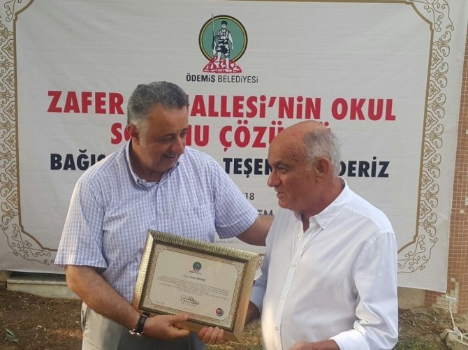 Ödemiş ilçesi bağlı hızla büyüyen Zafer Mahallesi’nde, ilkokul ihtiyacının giderek artması üzereine bağışçılar harekete geçti. 17 bağışçı da, elinin taşın altına koyarak Adnan Menderes Bulvarındaki odun ve kömür depolarının bulunduğu alanın yanındaki atıl halde bulunan 6 bin 700 metrekarelik bir araziyi belediyeye bağışladı. Bağış ve tapu tahsis işlemlerinin ardından ise bağışçılara teşekkür belgesi dağıtım töreni düzenlendi.