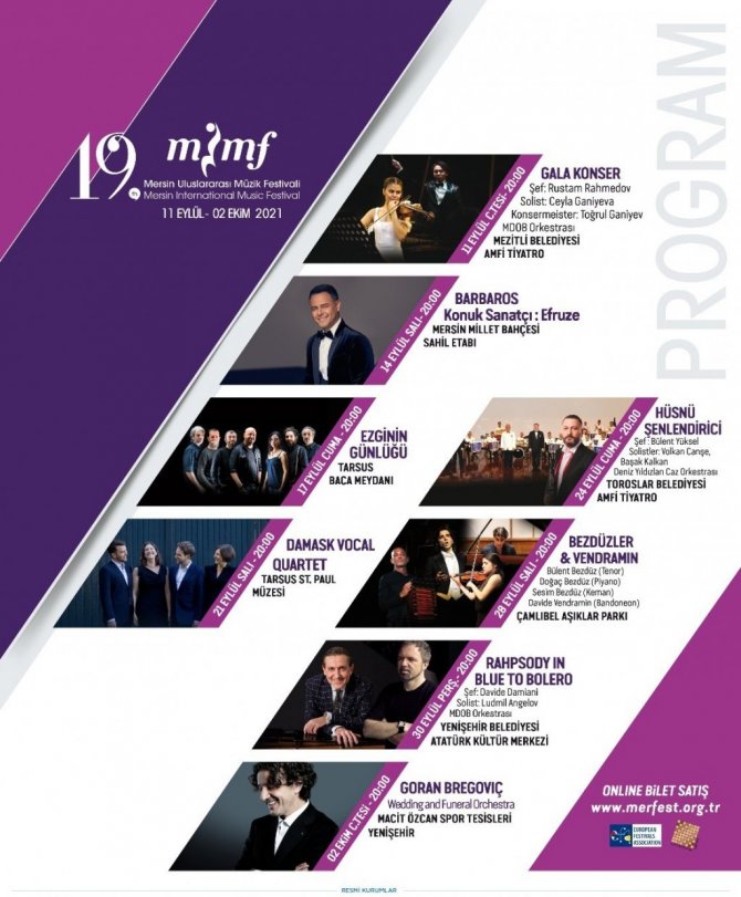 Geçen yıl korona virüs salgını nedeniyle iptal edilen Mersin Uluslararası Müzik Festivali, bu yıl 8 etkinlikle dev sanatçıları Mersin'de buluşturacak. 11 Eylül-2 Ekim tarihleri arasında 19'uncusu gerçekleştirilecek festivalde, Balkan müziğinin efsane ismi Goran Bregoviç'ten Ezginin Günlüğü'ne, Hüsnü Şenlendirici'den Bulgar piyano virtüözü Ludmil Angelov ve Mersin'in yetiştirdiği opera sanatçısı Bülent Bezdüz'e kadar birçok sanatçı, sanatseverleri müziğe doyuracak.