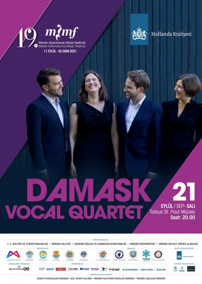 19. Mersin Uluslararası Müzik Festivali, bu yıl 11 Eylül-2 Ekim tarihleri arasında gerçekleştirilecek. Festival komitesinden yapılan açıklamaya göre, Avrupa festivallerinin vazgeçilmez akapella dörtlüsü Damask Vocal Quartet, Tarsuslularla buluşacak. Adını Ortadoğu'ya özgü kumaş tasarımından alan Holanda merkezli ve dört farklı ulus sanatçılarından oluşan Damask Vocal Quartet, soprano Katharine Dain, mezzo-soprano Marine Fribourg, tenor Edward Leach ve bariton Drew Santini'den oluşuyor.