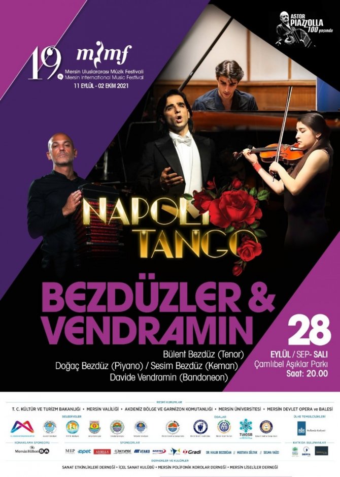 Dünyaca ünlü opera sanatçısı Bülent Bezdüz ise Astor Piazzolla'nın 100. doğum yılı anısına klasik müziğin genç yıldızlarıyla aynı sahnede buluşacak. Grammy ödüllü sanatçı Bülent Bezdüz, klasik müziğin genç yıldızları Sesim Bezdüz (keman), Doğaç Bezdüz (piyano) ve Davide Vendramin (bandoneon) ile birlikte aynı sahnede yer alarak Astor Piazzolla'nın 100. doğum yılı anısına festival için hazırlanan özel bir konsere imza atacak. Tangoların seslendirileceği konser, 28 Eylül'de saat 20.00'de Çamlıbel Aşıklar Parkında ücretsiz olarak yer alacak.