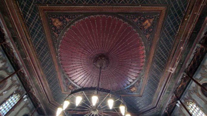 Yozgat'ta 221 yıl önce inşa edilen ahşap işlemeleri, el işi duvar süslemeleri ve barok tarzı motiflerin bulunduğu tavan mimarisi ile dikkat çeken Başçavuşzade cami görünümü ile dikkat çekiyor.