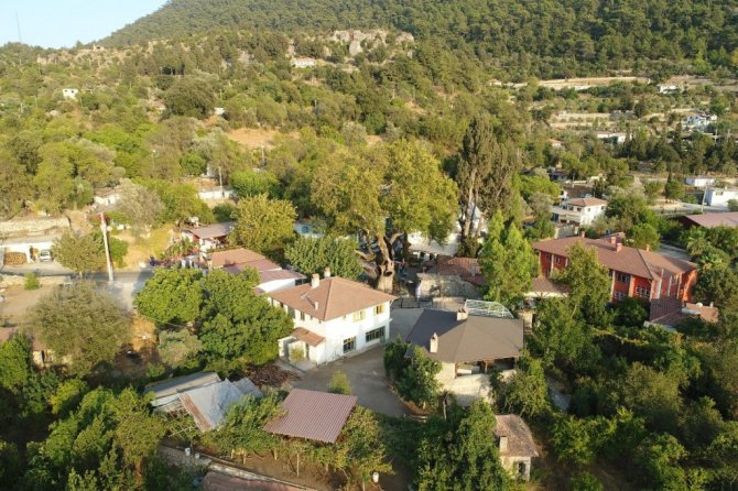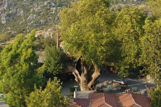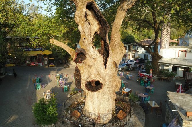 Marmaris'te yaklaşık 2 bin yıldır ayakta duran ağaç tarihe meydan okuyor. Ağacın yaşam süresini uzatmak için ise katran ve bitkisel karışımlarla pansuman yapılıyor. Yerli ve yabancı turistlerin ilgi odağı olan ağaç havadan görüntülendi.