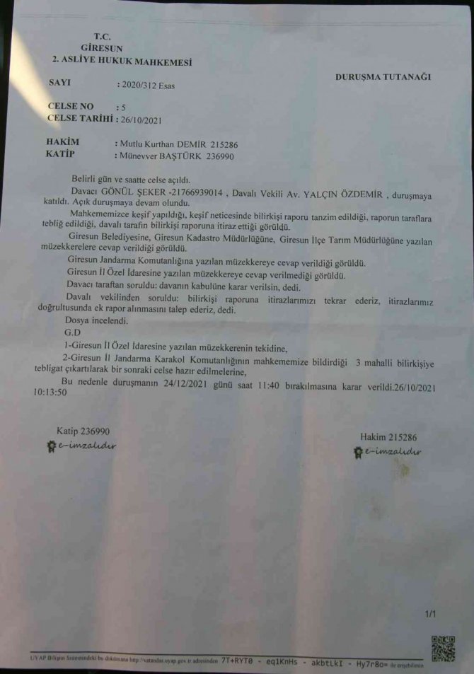 Arazi varislerinden İsmail Karakaya ise, "Yolun geçtiği arazi üzerinde hiçbir çalışma yapamadığımız gibi paylaşımda yapamıyoruz. Mahkeme kararının son anına kadar hakkımızı arayacağız. Şuanda mahkeme kararına göre yolu kapatma hakkına sahibiz, ancak vicdanımız köylüleri yolsuz bırakmak istemiyor. Buna rağmen mağdur edilirsek biz de çaresiz yolu kapatacağız ve yeniden fındık bahçesine dönüştürerek varisler arasında paylaşım yapmak zorunda kalacağız" dedi.