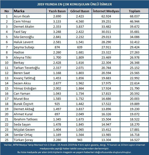 Yapımcılığını yaptığı programlar ve Şeyma Subaşı ile boşanmasıyla geçtiğimiz yılın en çok konuşulan ismi olan Acun Ilıcalı, 2019 yılının en popüler ismi oldu. Fenerbahçe ve Erzurumspor için düzenlediği destek kampanyaları ile medya odağı olan Ilıcalı, MTM’nin raporuna göre 2019 yılında toplam 68 bin 37 habere konu edildi.