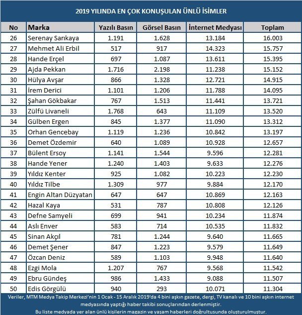 Medya Takip Merkezi (MTM), Magazin Gazetecileri Derneği için yaptığı araştırmada 2019 yılında magazin ve sanat dünyasında yaşanan gelişmeleri ve adından sıkça söz ettiren ünlü isimleri belirledi.