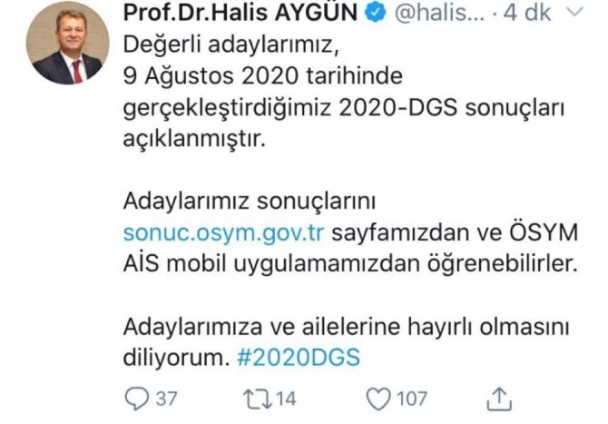 ÖSYM Başkanı Prof. Dr. Halis Aygün, 2020-DGS sonuçlarının açıklandığını duyurdu.