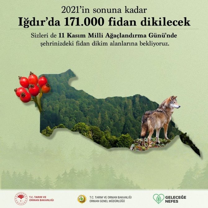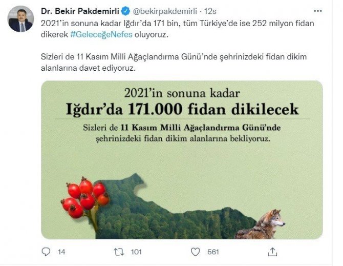 Tarım ve Orman Bakanı Bekir Pakdemirli, Twitter hesabından yaptığı paylaşımda, bu yılsonuna kadar dikilecek fidanlara ilişkin bilgi verdi. Bakan Pakdemirli, paylaşımında şunları kaydetti: "2021'in sonuna kadar Iğdır'da 171 bin, tüm Türkiye'de ise 252 milyon fidan dikerek "Geleceğe Nefes" oluyoruz. Sizleri de 11 Kasım Milli Ağaçlandırma Günü'nde şehrinizdeki fidan dikim alanlarına davet ediyoruz."