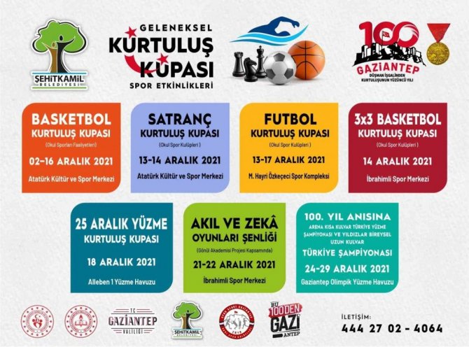 Kültür, sanat, tarih, eğitim, müzik ve spor gibi alanlarda yapılacak etkinliklere ilişkin açıklamada bulunan Şehitkamil Belediye Başkanı Rıdvan Fadıloğlu, "Şehitkamil Belediyesi olarak, 25 Aralık Gaziantep'in düşman işgalinden Kurtuluşu ile ilgili çok sayıda etkinliğimiz olacak. İlk etkinliğimiz, 9 Aralık 2021 Perşembe günü saat 20.00'da Şehitkamil Kültür ve Kongre Merkezi'nde Gaziantep'in Kurtuluşu'nun 100. Yılına Özel İhsan Güvenç Konseri ile başlayacak. Ardından, 14 Aralık 2021 Salı günü saat 15.00'da Şehitkamil Sanat Merkezi içerisinde yer alan Sanat Galerisi'nde Fotoğraflarla Gaziantep Savunmasından Kesitler 100. Yıl Özel Sergisi açılacak. 15 Aralık 2021 Çarşamba günü saat 14.00'da Şehitkamil Sanat Merkezi'nde 9. ve 10. sınıflar arası 100. Yılında 100 Soruda Antep Savunması Bilgi Yarışması Ödül Töreni yapılacak. 17 Aralık 2021 Cuma günü saat 20.00'da Şehitkamil Kültür ve Kongre Merkezi'nde Bilkent Senfoni Orkestrası tarafından Gaziantep'in Kurtuluşu'nun 100. Yılına Özel Konser verilecek. 18 Aralık 2021 Cumartesi günü saat 15.00'da Alleben 1 Yüzme Havuzu'nda 10. Geleneksel 25 Aralık Yüzme Kurtuluş Kupası Yarışları yapılacak. 16 Aralık 2021 Perşembe günü saat 15.00'da Atatürk Kültür ve Spor Merkezi'nde 8. Geleneksel Basketbol Kurtuluş Kupası Ödül Töreni yapılacak. 13 Aralık 2021 Pazartesi günü saat 10.30'da Atatürk Kültür ve Spor Merkezi'nde 44. Geleneksel Satranç Kurtuluş Kupası Müsabakaları yapılacak. 14 Aralık 2021 Salı günü saat 17.00'da İbrahimli Spor Merkezi'nde 2. Geleneksel 3x3 Basketbol Kurtuluş Kupası Ödül Töreni yapılacak. 21 Aralık 2021 Salı günü saat 11.00'da İbrahimli Spor Merkezi'nde Geleneksel Kurtuluş Kupası Spor Etkinlikleri Akıl ve Zeka Oyunları Şenliği yapılacak. 17 Aralık 2021 Cuma günü saat 14.00'da Gazikent Stadyumu'nda 4. Geleneksel Futbol Kurtuluş Kupası Ödül Töreni yapılacak. 28 Aralık 2021 Salı günü saat 15.00'da Gaziantep Olimpik Yüzme Havuzu'nda Geleneksel Kurtuluş Kupası Spor Etkinlikleri Şehitkamil Anısına / Arena Kısa Kulvar Türkiye Yüzme Şampiyonası ve Yıldızlar Bireysel Uzun Kulvar Türkiye Şampiyonası Açılış Seremonisi yapılacak. Düzenleyeceğimiz etkinliklere tüm halkımız davetlidir" diye konuştu.