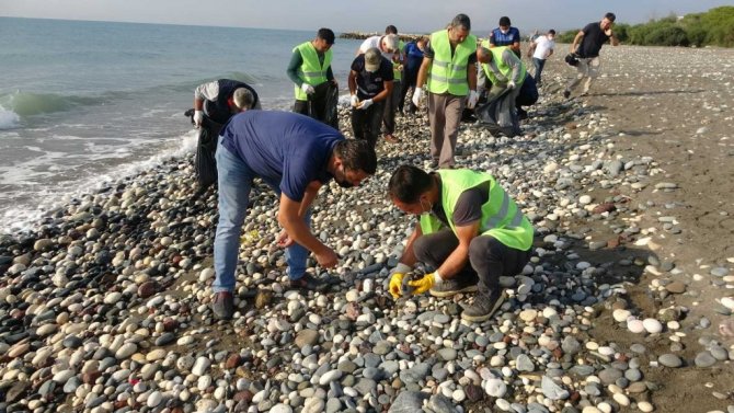 Mersin'in Erdemli ilçesine ulaşan Suriye kaynaklı petrol sızıntısının temizlenmesi için ilçe belediyesi yaklaşık 25 kilometrelik sahil şeridinde temizlik çalışması yaptı.