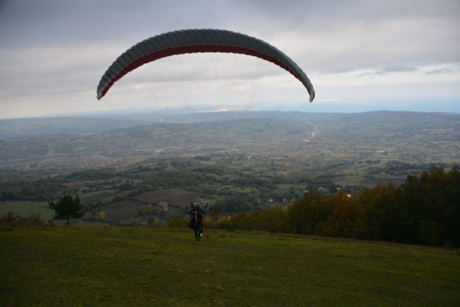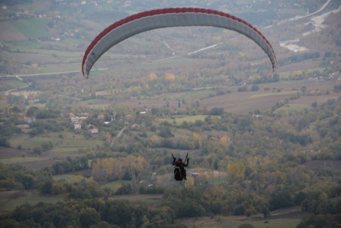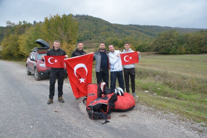 Sinop'ta yaklaşık 10 kişiden oluşan paraşüt ekibi, 29 Ekim Cumhuriyet Bayramı'nda farkındalık oluşturmak amacıyla Sinop'un Karlı köyünde yamaç paraşütü yaparak yaklaşık 600 metre yükseklikten uçtu.