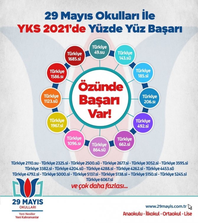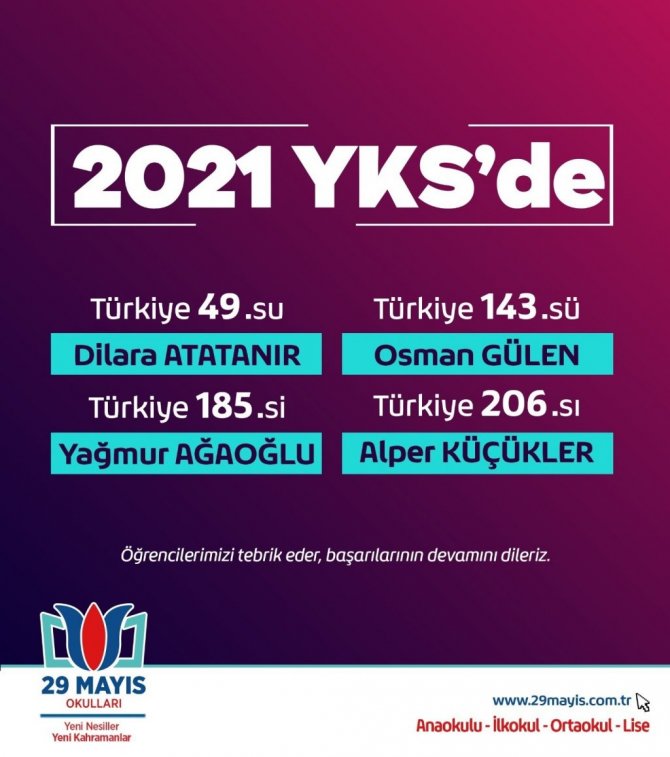 2021 YKS'de 29 Mayıs Okulları öğrencisi Dilara Atatanır Türkiye 49'uncusu, Osman Gülen Türkiye 143'üncüsü, Yağmur Ağaoğlu Türkiye 185'incisi, Alper Küçükler ise Türkiye 206'ncısı oldu. Okul Genel Müdürü Bahri Kahya, özel liselerinde eğitim gören 12. sınıf öğrencilerinin elde ettiği başarıların salgın şartlarına rağmen eğitimin ve sınavlara hazırlık sürecinin ne denli disiplinli ve başarılı uygulandığını gözler önüne serdiğini ifade etti. 2021 YKS sonuçlarına göre Türkiye genelinde ilk 50'de 1, ilk binde 7, ilk 5 binde 26, ilk 10 binde 39, ilk 20 binde 66, ilk 50 binde 90 derece elde edildiğini ifade eden Kahya, "Tüm dünyayı etkisi altına alan salgın sürecinde İzmir ve Ankara'daki okullarımızda uzaktan eğitim ve sınava hazırlık çalışmaları büyük bir titizlikle uygulanmış, maksimum başarı sağlanması için büyük çaba harcanmıştır. Okullarımızda uyguladığımız YKS ve LGS hazırlık programları sayesinde elde edilen bu başarıların tesadüf olmadığını görüyoruz. Uzun ve zorlu geçen bu maratonun ardından öğrencilerimizi ve öğrencilerimizin başarısında emeği geçen tüm öğretmenlerimizi, velilerimizi ve idarecilerimizi tebrik ediyor, öğrencilerimize üniversite hayatlarında da başarılar diliyorum" dedi.