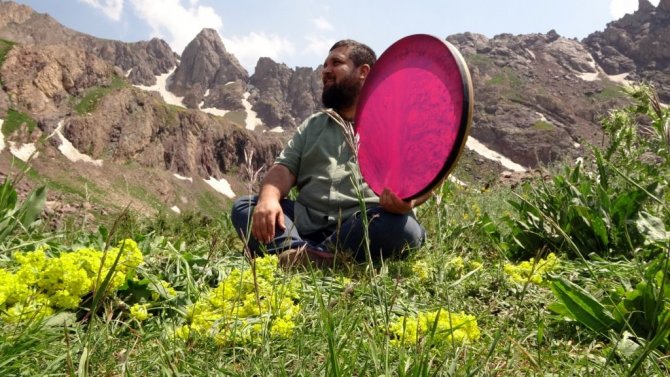 Hakkari'nin Yüksekova ilçesinde, milli park ilan edilen 3 bin 400 rakımlı Cilo ve Sat Dağlarındaki buzullara giden sanatçı Sedat Anar, dinleyenlerine santur...