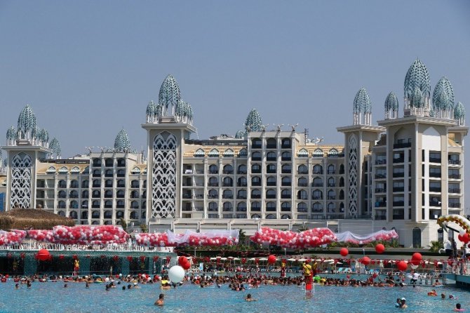 Turizmin başkenti Antalya’da Granada Luxury Belek Otel’de, 30 Ağustos Zafer Bayramı etkinlikleri kapsamında 3 bin tatilci aynı anda havuza girerek rekor denemesi yaptı. Sayımların tamamlanmasının ardından otel Guinness Dünya Rekorlar Kitabı’na başvuru yapacak.
