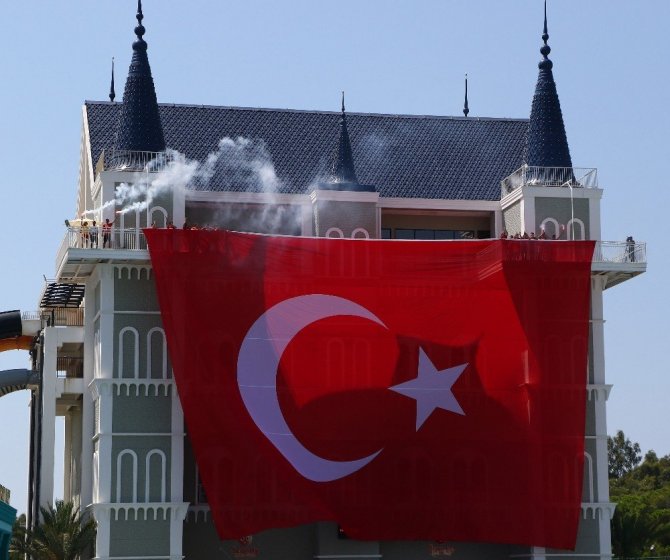 Türkiye’nin en büyük 10 bin metrekarelik havuzda 3 bin yerli ve yabancı misafirin olduğunu kaydeden Özsinan, "Tüm misafirlerimizle bugünün anlam ve önemini belirten ekinlik ve gösteriler yapıyoruz. 3 bin misafirimizi aynı anda havuza sokup rekor denemesi yaptık. Bu da başarılı sonuçlandı. Gösterilerimiz ve şovlarımız oldu. Kulemizin etrafını 35 metreden uzun dev Türk bayrağımızı açtık. Bizim ve misafirlerimiz için çok önemli bir etkinlikti" dedi.