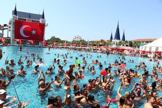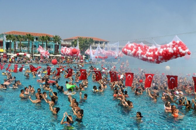 10 bin metrekare kapasitesiyle Türkiye’deki en büyük yüzme havuzuna sahip otelde 3 bin tatilci büyük zaferin yıl dönümünde aynı havuza girerek rekor denemesi yaptı. 10. Yıl ve İzmir Marşı eşliğinde 3 bin yerli ve yabancı turist noter huzurunda aynı anda havuza girdi. Ellerinde Türk bayrakları ve kırmızı beyaz balonlarla rekor denemesine ortak olan tatilciler 30 Ağustos’u havuzda kutladı. Ayrıca havuzun karşısındaki ikiz kulelere havuzdaki misafirlerin alkışları eşliğinde dev Türk bayrağı açıldı. Havuz üzerindeki balon yığınlarını düşürmeye çalışan tatilci bir kadının çabası renkli görüntüler oluşturdu. Rekor denemesi havadan da görüntülendi.