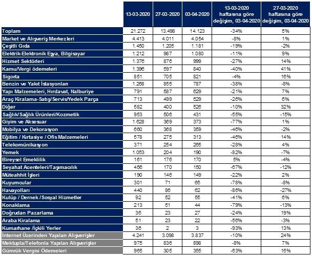 Bir önceki yılın aynı dönemine (15 Mart - 5 Nisan 2019) göre kıyaslandığında 13 Mart - 3 Nisan 2020’de en fazla artış market ve alışveriş merkezleri (yüzde 48), elektrik-elektronik eşya, bilgisayar (yüzde 27) ve çeşitli gıda (yüzde 23) harcamalarında görüldü. Aynı dönemde harcamalar en fazla havayolları (yüzde 59), konaklama (yüzde 51), kumarhane/içkili yerler (yüzde 44), seyahat acenteleri/taşımacılık (yüzde 43) ve kamu/vergi ödemeleri (yüzde 39) harcamalarında azaldı.