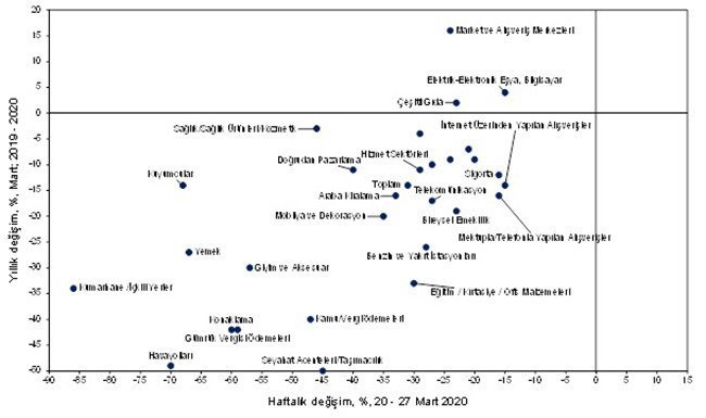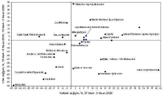 Market ve alışveriş merkezleri, elektrik-elektronik eşya, bilgisayar, hizmet sektörleri vb. harcama kalemleri hem yıllık hem de haftalık bazda artış gösterdi. Sol alt kısımda bulunan havayolları, konaklama, seyahat ve taşımacılık, benzin ve yakıt istasyonları ve kuyumcular vb. harcama kalemleri ise hem yıllık hem de haftalık bazda düşüş gösteren sektörlerdir. Bu sektörlerin kovid-19 salgını nedeniyle harcamaların en fazla kısıtlandığı sektörler olduğu görüldü. Sol üst kısımda yer alan çeşitli gıda ve sağlık/sağlık ürünleri/kozmetik sektörleri yıllık bazda artış gösteren fakat haftalık değişimde düşüşe geçen sektörler oldu. Sağ alt kısımda bulunan eğitim/kırtasiye/ofis malzemeleri, kumarhane /içkili yerler ve telekomünikasyon sektörleri ise yıllık bazda azalan ancak haftalık bazda hareketlenme görülen sektörler oldu.