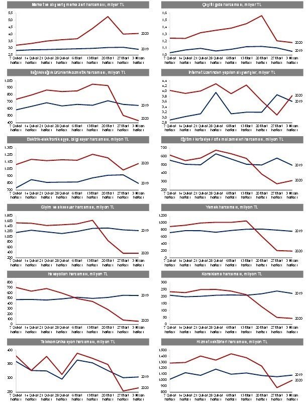 Yemek, giyim ve aksesuar, mobilya ve dekorasyon harcamaları 13 Mart haftasına kıyasla 3 Nisan haftasında sırasıyla yüzde 82, yüzde 77 ve yüzde 46 azaldı. Bir önceki haftaya kıyasla ise 3 Nisan haftasında yemek harcaması (yüzde 7), mobilya ve dekorasyon harcaması (yüzde 2) azalırken, giyim ve aksesuar harcaması sınırlı bir artış (yüzde 1) gösterdi.