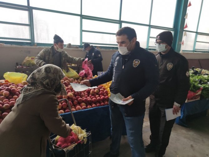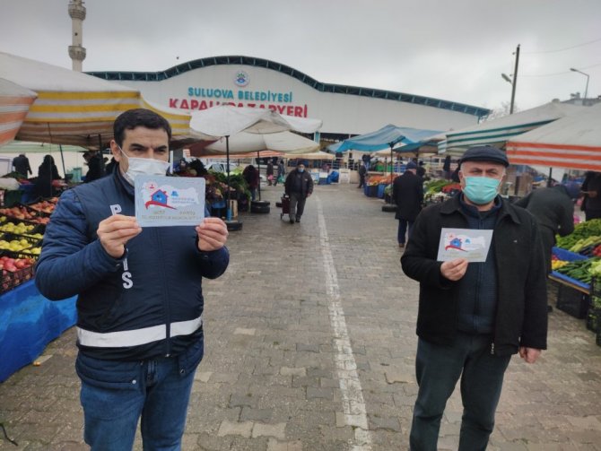 Amasya'nın Suluova İlçesi İlçe Emniyet Müdürlüğü ve Suluova Belediyesi zabıta ekipleri, salgına karşı vatandaşların daha duyarlı olması için ortak çalışmalarını aralıksız sürdürüyor. Ekipler, virüs bulaşma riskinin önüne geçmek ve farkındalık oluşturmak için adeta seferber oldu. Ekipler pazar tezgahlarını tek tek dolaşarak broşürler dağıttı, vatandaşlara sözlü olarak uyarı ve bilgilendirmelerde bulundu.