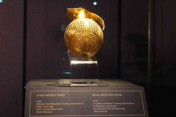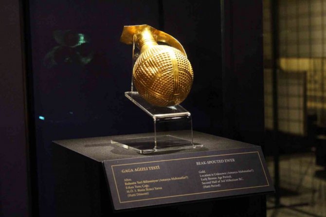 Kültür ve Turizm Bakanı Ersoy, Ankara Anadolu Medeniyetleri Müzesi'nde 4 bin 250 yıllık altın gaga ağızlı testinin İngiltere'den Türkiye'ye iade edilmesi üzerine düzenlenen törene katıldı. Arthur Gilbert, altın ve gümüş eserlerden oluşan koleksiyonunu tamamlamak için altın gaga ağızlı testiyi 1989'da Los Angeles'ta satın aldı. Londra'daki Victoria&Albert Müzesi'ne verilen gaga ağızlı testinin Anadolu'dan yasa dışı çıkarılması ihtimaline karşı kapsamlı araştırmalar yapıldı. Testinin araştırmalar ile Anadolu'ya ait olduğunun anlaşılması sonucunda, Gilbert Sanat Vakfı tarafından, Kültür ve Turizm Bakanlığı ile temasa geçilerek, bugün Anadolu Medeniyetler Müzesi'ne iade edildi.