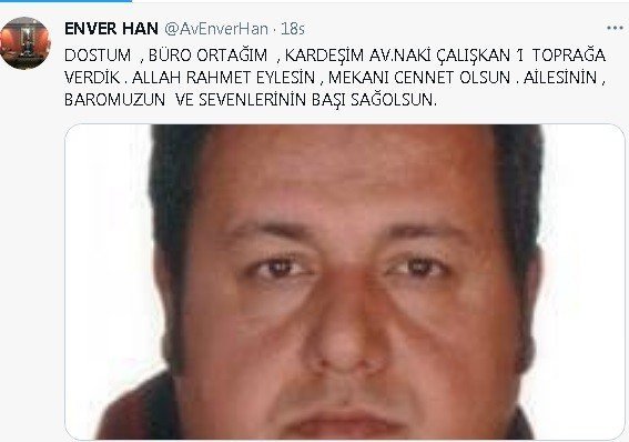 Malatya Barosu Başkanı Avukat Enver Han, sosyal medya hesabında yaptığı açıklamada, "Dostum, büro ortağım, kardeşim Avukat Naki Çalışkan "ı toprağa verdik . Allah rahmet eylesin, mekanı cennet olsun. Ailesinin, baromuzun ve sevenlerinin başı sağ olsun" dedi.