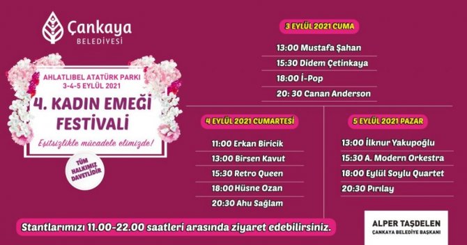 Çankaya Belediyesi, kadınların el emeği ürünlerinin satışa sunulduğu "Kadın Emeği Festivali'ni bu yıl 4'üncü kez düzenliyor. 3, 4 ve 5 Eylül'de Ahlatlıbel Atatürk Parkı'nda Başkentlilerle buluşacak festivalde, 300'e yakın Çankayalı kadının el emeği ürünleri satışa sunulacak. Festivale katılmak, kadın emeği ile dolu stantları gezmek isteyen Başkentliler için belediyenin ücretsiz servisleri üç gün boyunca Kolej-Ahlatlıbel arasında hizmet verecek.