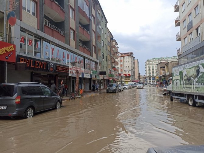 Iğdır'da 5 dakika kadar etkili olan sağanak yağmur ve dolu yağışı kent merkezinde yolları adeta göle çevirdi.