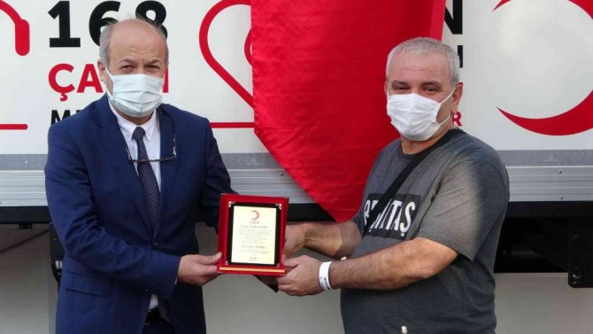 Açıklamaların ardından Uşak İl Sağlık Müdürü Sedat Kavas'ın plaket takdim ettiği Emin Şahin, daha sonra 420. kan bağışını gerçekleştirdi.