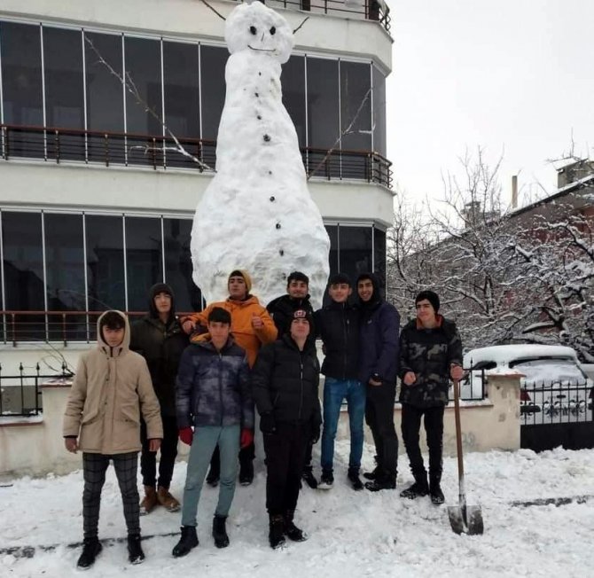 Erzincan'ın Demirkent mahallesinde bir araya gelen gençler, el ele vererek yaklaşık 4 saatte 6 metre boyunda dev bir kardan adam yaptı.