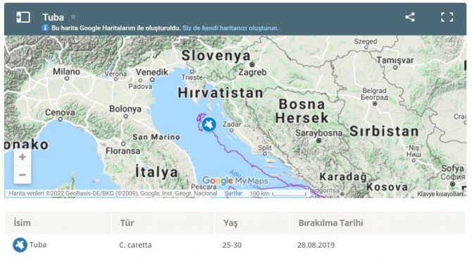 Muğla'da yarası tedavi edildikten sonra takip cihazı takılarak suya bırakılan deniz kaplumbağası Tuba, 3'üncü yılına giren ve 6 milyon kişinin izlediği yolculuğunda yaklaşık 16 bin kilometre yol kat ederek Hırvatistan sahillerine ulaştı.