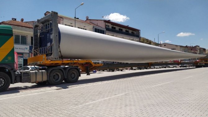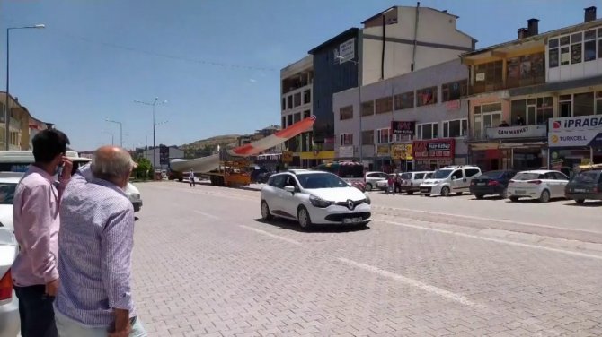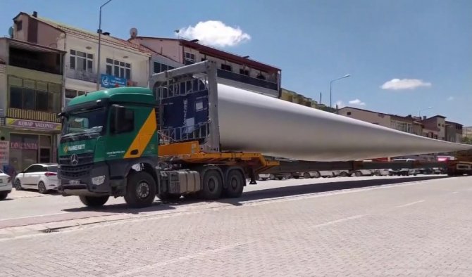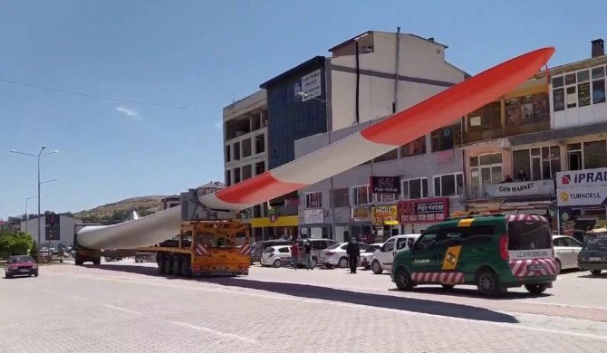 Sivas'ın Gürün ilçesinde 60 metre uzunluğundaki rüzgar gülü pervanelerinin geçişi şaşkınlığa neden oldu.