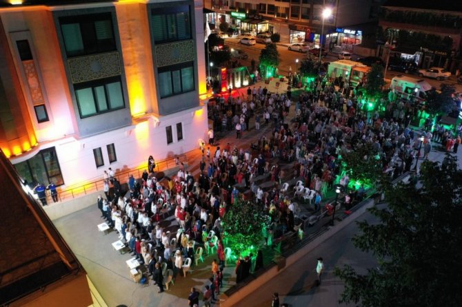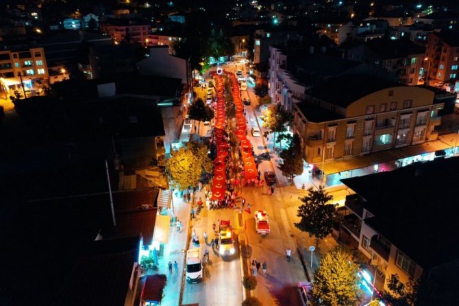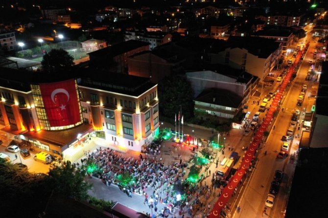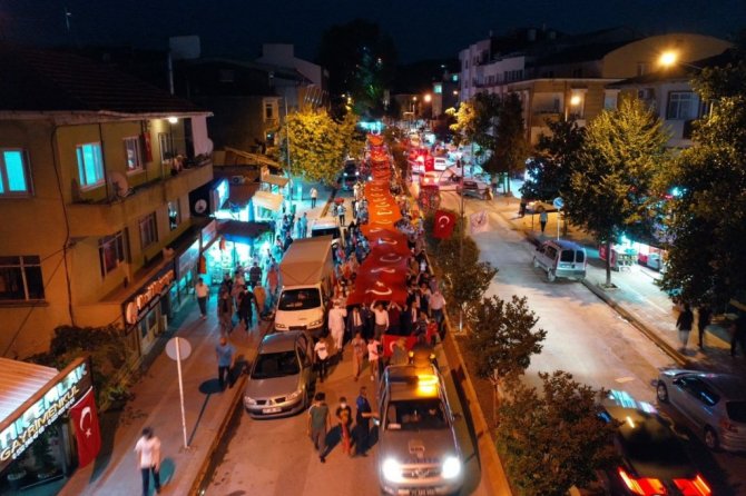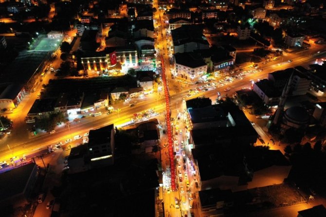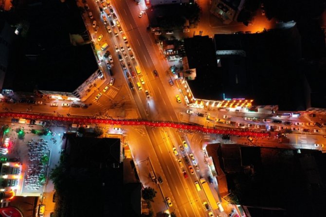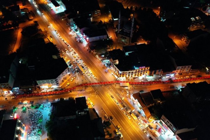 600 metrelik Türk bayrağı drone ile havadan görsel bir şölen oluştururken, kalabalık daha sonra ilçe merkezinde düzenlenen etkinlikte şehitler ve gaziler için dualar etti.