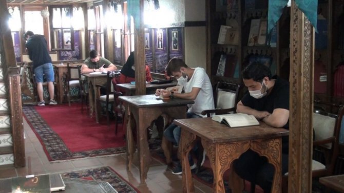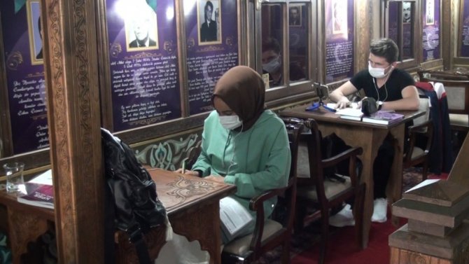 Kütahyalı öğrenciler, pandemi döneminde kitap kahveye dönüştürülen 600 yıllık tarihi tekkede sınavlara hazırlanıyor.
