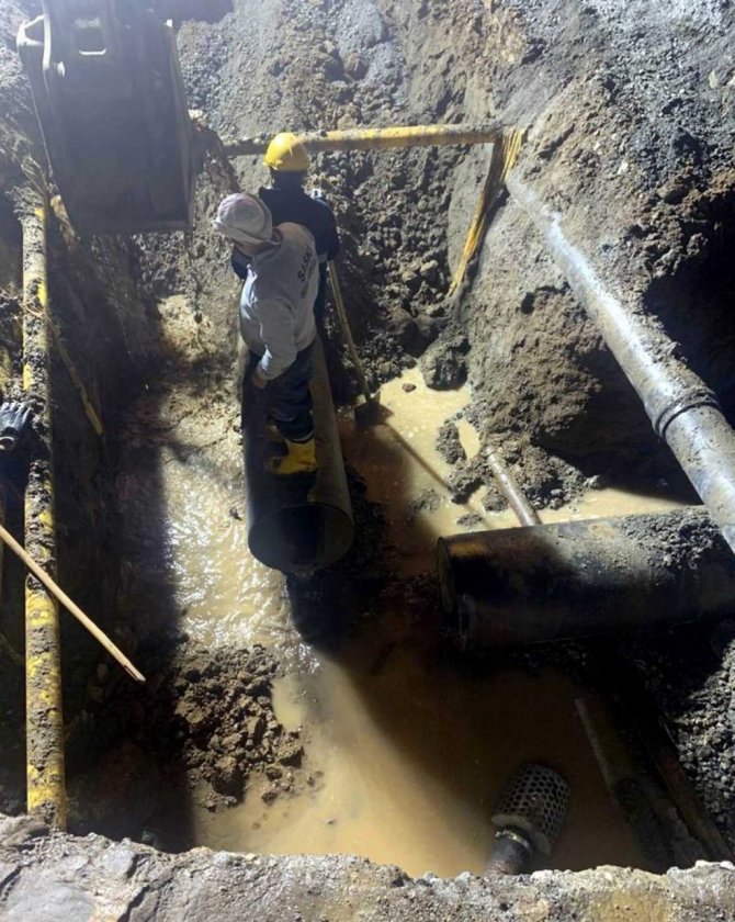 Yaşanan arıza nedeniyle 600'lük borunun boşaldığını ifade eden Bahattin Yanık, "Söz konusu yerde bizim su borusundan kaynaklanan bir durum oldu. Alt yapı çalışması sırasında su borusuna zarar verildi. Şu anda tamirat işlemleri devam ediyor. Arıza olunca mecburen borunun içindeki su çevreye yayıldı. Boru tam anlamıyla boşaldı. 90 derece dönen bir dirsek var. O dirsekte bir arıza meydana gelmiş. Taflan tarafına doğru giden 600'lük boru hattı, branşman hattında sıkıntı olmuş. Şu anda 5-6 mahallenin suyu yok. Bu gibi arızalarda suyun mecburen boşalması gerekiyor. Zarar gören boru, çeliğin biraz değişiği olan dokür boru. Görüntü itibariyle su birikintisi oluştu. Şu an itibarıyla su tamamen boşaldıktan sonra arızanın olduğu bölge ayarlanıyor. Gece yarısına kadar tamirat bitecek, tamiratın ardından beton atılacak. O betonun sertleşmesinin ardından su olmayan mahallelere su verilecek. Suyun verilmesi sabah saatlerini bulabilir" dedi.