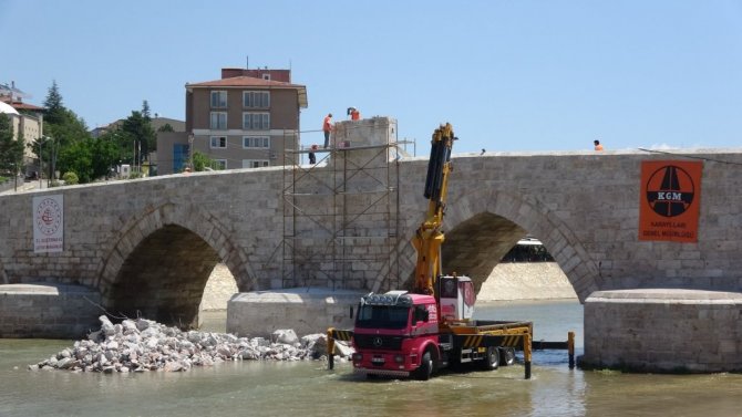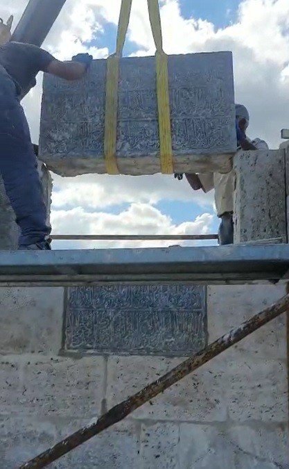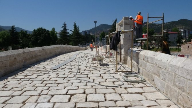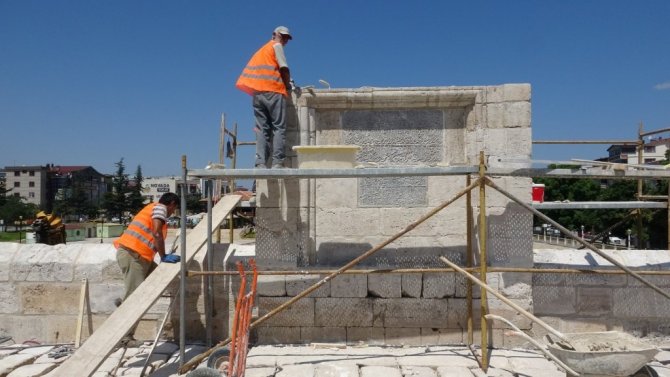 Tokat'ta tarihi köprüde yapılan restorasyon çalışmaları kapsamında konservatör uzmanı tarafından yazıtlarının temizliği yapılan 770 yıllık kitabe yerine konuldu.