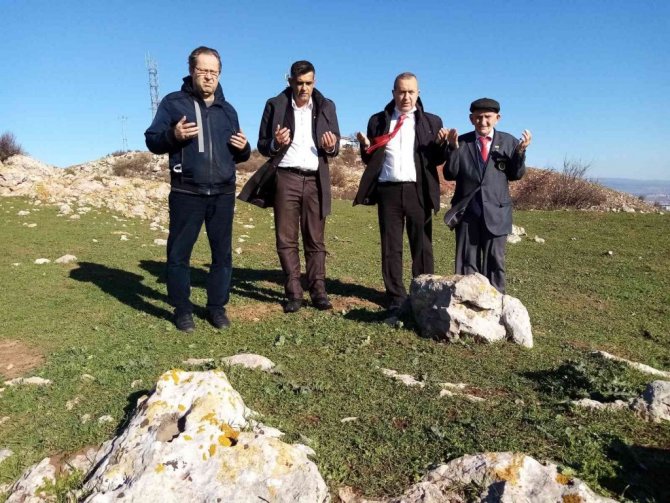 Deliklibayır tepesinde keşif çalışması yapan Dernek Başkanı Ecevit Karakoyun ve dernek üyeleri kabirleri tespit edilen şehit askerler için Fatiha okudular.