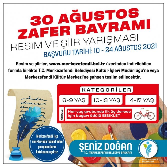 6 ile 17 yaş arasındaki tüm Merkezefendili çocukları ve gençleri 30 Ağustos Zafer Bayramı Resim Ve Şiir Yarışması'na katılmaya davet eden Merkezefendi Belediye Başkanı Şeniz Doğan, "Kültürel faaliyetlerimize devam ediyoruz. İlçemizi kültürün ve sanatın merkezi yapmak, çocuklarımızın ve gençlerimizin kültür, sanat ve edebiyat ile buluşmasını hedefliyoruz. Ulu Önder Gazi Mustafa Kemal Atatürk'ün liderliğinde başlatılan kurtuluş mücadelesinde büyük bir zafere ulaştığımız 30 Ağustos Zafer Bayramımıza özel resim ve şiir yarışması düzenliyoruz. Çocuklarımızın milli duygular ile kâğıda dökecekleri resim ve şiirler bizler için çok değerli. Onların gözünden, bu zaferin büyüklüğünü tekrardan görmek istiyoruz. Tüm Merkezefendili çocuklarımızın ve gençlerimizin değerli eserlerini bekliyoruz" diye konuştu.
