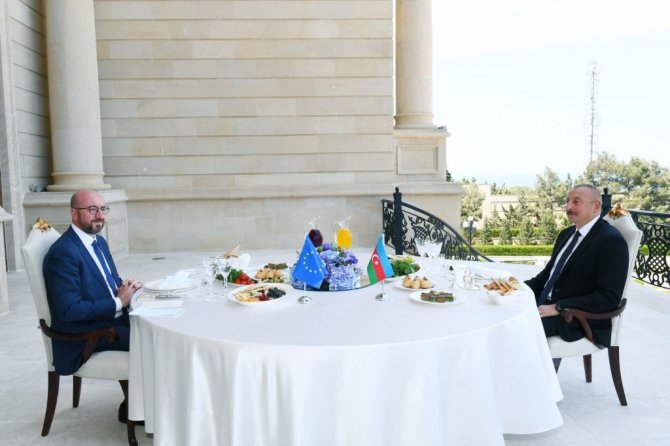 Avrupa Birliği (AB) Konseyi Başkanı Charles Michel, Azerbaycan ziyaretinde Cumhurbaşkanı İlham Aliyev ile çalışma yemeğinde bir araya geldi.