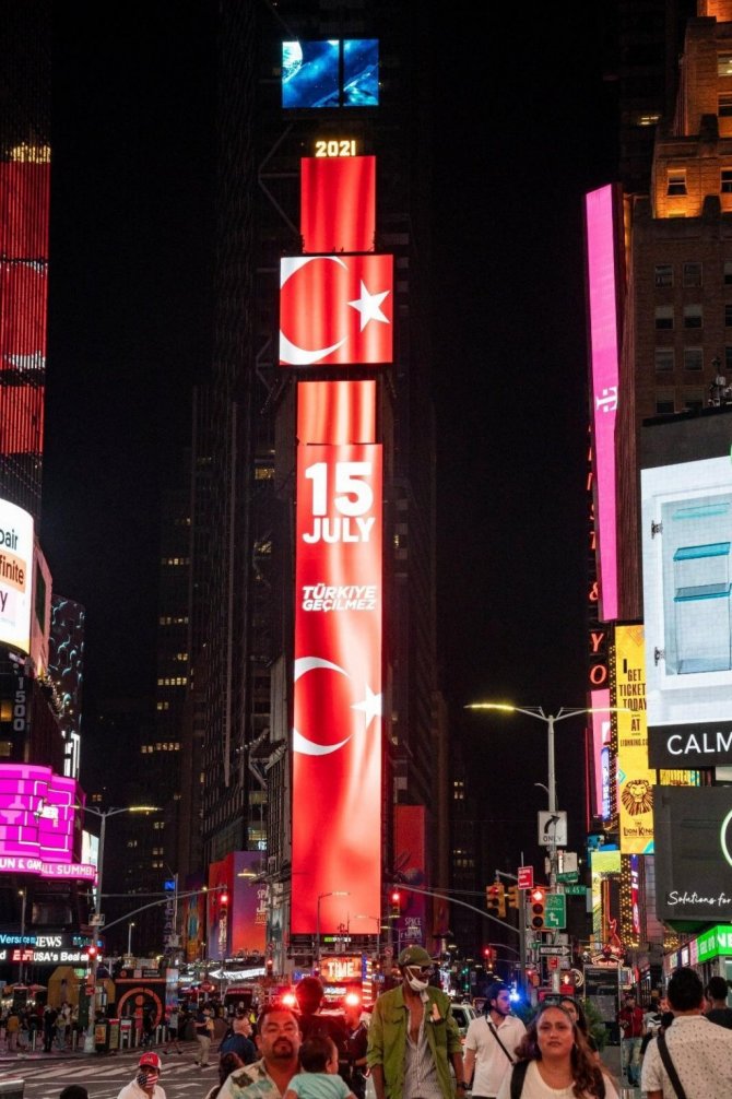 ABD'nin New York kentinde bulunan ünlü Times Meydan'ındaki dev ekranlarda Fetullahçı Terör Örgütü'nün (FETÖ) 15 Temmuz hain darbe girişimi anlatıldı.