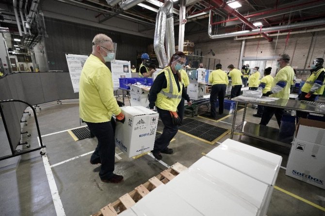 ABD'li ilaç şirketi Pfizer, kargo şirketleriyle yapılan çalışmayla ilk teslimatın tamamının 2 gün içerisinde tamamlanabileceğini açıkladı. Toplam 2,9 milyon doz aşı 50 eyalete dağıtılacak ve 21 gün sonra yine aynı bölgelere 2.9 milyon doz daha aşı ulaştırılacak. Acil durumlar için Michigan'deki Portage kentinde yer alan tesiste yaklaşık 500 bin aşı yedek olarak bekletilecek.