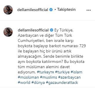 Michael Jackson ve Whitney Houston başta olmak üzere birçok ünlü sanatçının vokalistliğini yapan ve Türkiye'ye yerleştikten sonra Müslüman olan ABD'li şarkıcı Della Miles, resmi sosyal medya hesabında bir paylaşım yaparak İsrail'e karşı boykot çağrısında bulundu. Ünlü sanatçı yaptığı paylaşımda, "Ey Türkiye, Azerbaycan ve diğer tüm Türk cumhuriyetleri, ben İsrail'e karşı boykota başlayıp barkod numarası 729 ile başlayan hiç bir ürünü artık almayacağım. Sende benimle birlikte aynı boykota katılır mısın? Bu boykota tüm Müslüman âlemini davet ediyorum" ifadelerini kullandı.